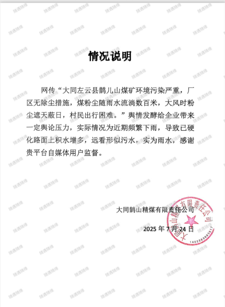 近日,大同鹊儿山精煤有限责任公司因环境污染问题被媒体曝光后,非但没有积极整改,反而试图通过删稿掩盖问题。 这一行为不仅暴露了企业漠视生态环境与公共健康的姿态,更折射出某些地方在环保监管与企业发展间的扭曲逻辑用村民的健康换取煤矿的经济利益,成