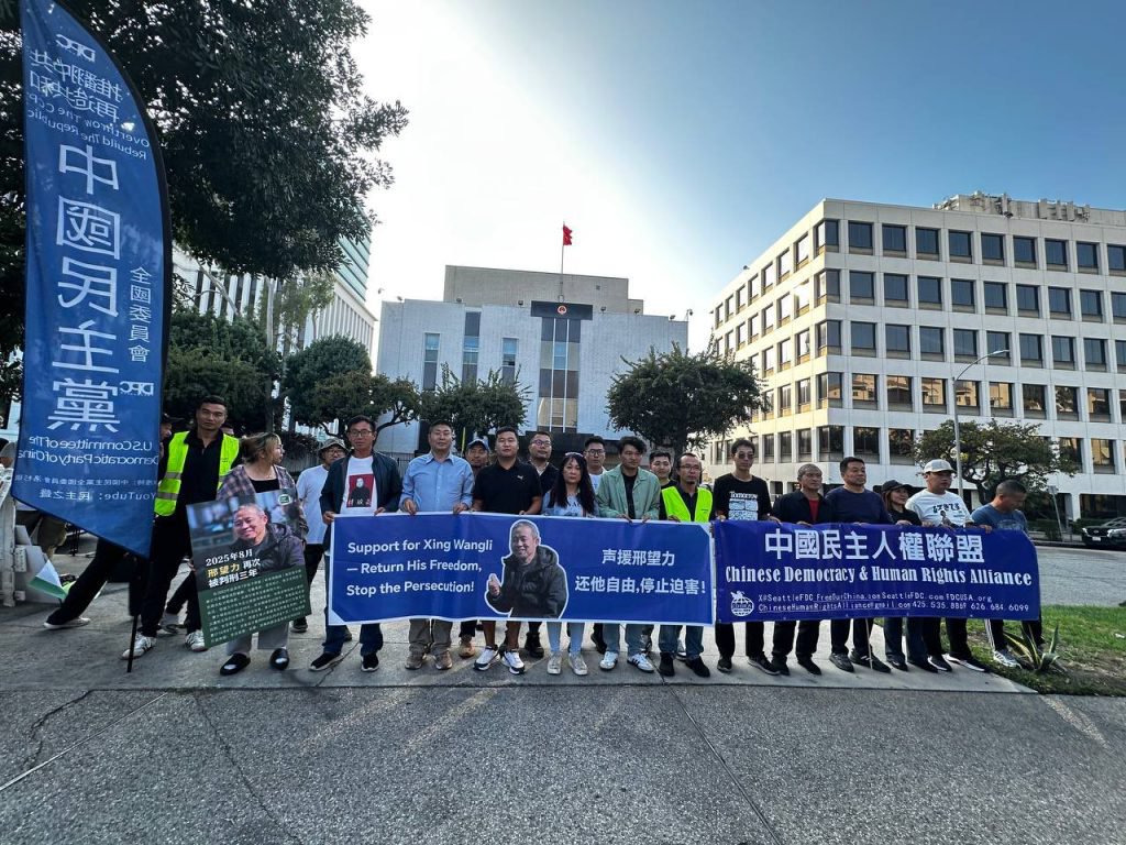 民主人士洛杉矶中领馆前集会 吁释放邢望力、张盼成等良心犯 10月25日,第761次茉莉花行动,60余人到场声援邢望力、张盼成等良心犯(主办方提供) 【大纪元2025年10月27日讯】(洛杉矶讯)第761次“茉莉花行动”于2025年10月25日下午4时在中共驻洛杉矶总领馆前举行,由中国民主党洛杉矶委员会、中国民主人权联盟、《在...