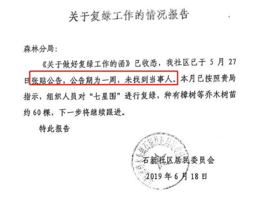 2019 年 7 月,东莞市林业局作出《关于报案处理情况的答复》(东林函【2019】454 号),称现场没有发现砍伐树木情况,属地社区已对该地块进行了植树复绿。同样,2019年 6 月 27 日,东莞市公安局森林分局答复关于北京市炜衡律师事务所出具的报案材料函的调查情况说明称,2019 年 5 月 27 日,由樟木头石新社区张贴通告一周(无法找到当事人),同年 6 月 19 日,由石新社区组织人员对该山头被开垦的林地进行植树复绿工作。