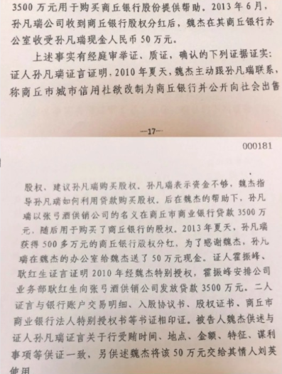 一审判决书第17页“3.2010年12月,被告人魏杰为孙凡瑞公司发放贷款3500万元用于购买商丘银行股份提供帮助。2013年6月,孙凡瑞公司收到商丘银行股份分红后,魏杰在其商丘银行办公室收受孙凡瑞现金人民币50万元。