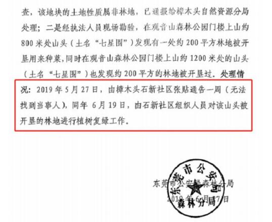 2019 年 7 月,东莞市林业局作出《关于报案处理情况的答复》(东林函【2019】454 号),称现场没有发现砍伐树木情况,属地社区已对该地块进行了植树复绿。同样,2019年 6 月 27 日,东莞市公安局森林分局答复关于北京市炜衡律师事务所出具的报案材料函的调查情况说明称,2019 年 5 月 27 日,由樟木头石新社区张贴通告一周(无法找到当事人),同年 6 月 19 日,由石新社区组织人员对该山头被开垦的林地进行植树复绿工作。
