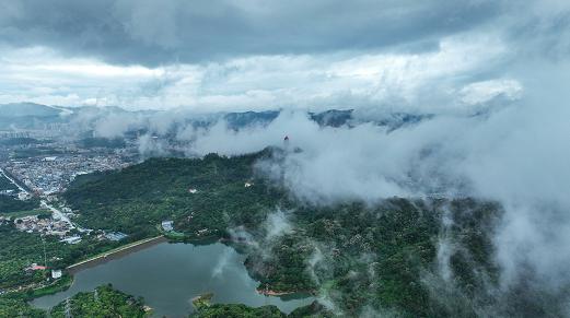 空中俯瞰广东观音山国家森林公园自然风光。 岭南四月,莺飞草长,风轻雨润。南粤大地处处云雾弥漫,春意盎然,呈现出一幅清新的水墨画卷。 位于广东东莞樟木头镇的广东观音山国家森林公园,此时别有一番风味,走进公园,入眼尽是春意盎然。山间云雾缭绕,如