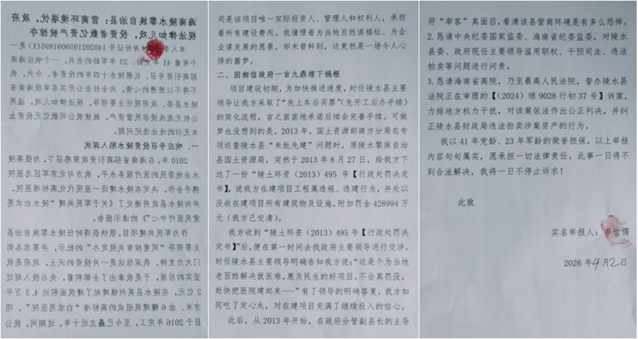 本人李世儒(身份证号14020219590918951X)是一个有着41年党龄、23年军龄的老兵,一个响应海南招商引资号召、扎根陵水十四年的投资者。今天,我不得不以愤懑的心情,向全社会公开实名举报海南省陵水县委、政府现任主要领导,视法律如儿戏,滥用公权无底线侵吞